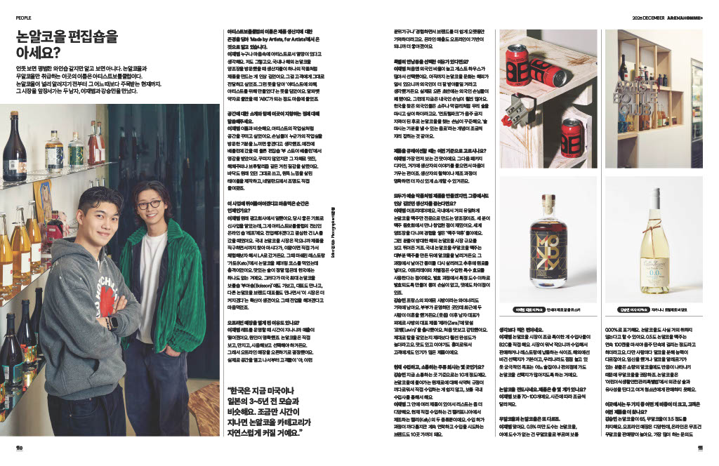 언뜻 보면 평범한 와인숍 같지만 알고 보면 아니다. 논알코올과 무알코올만 취급하는 이곳의 이름은 아티스트보틀클럽이다. 논알코올이 널리 알려지기 전부터 그 어느 때보다 주목받는 현재까지. 그 시장을 앞장서가는 두 남자, 이재범과 강승민을 만났다.